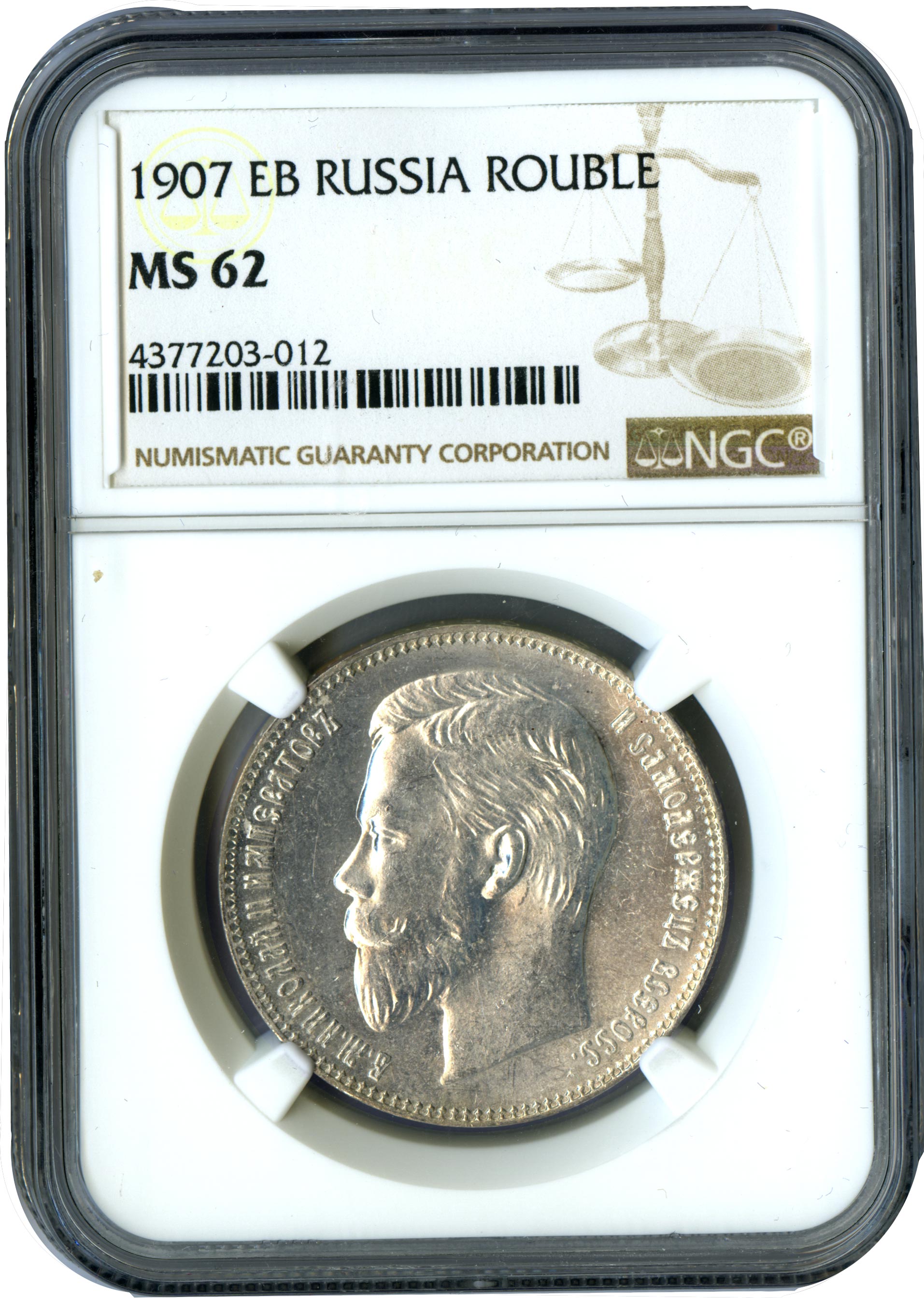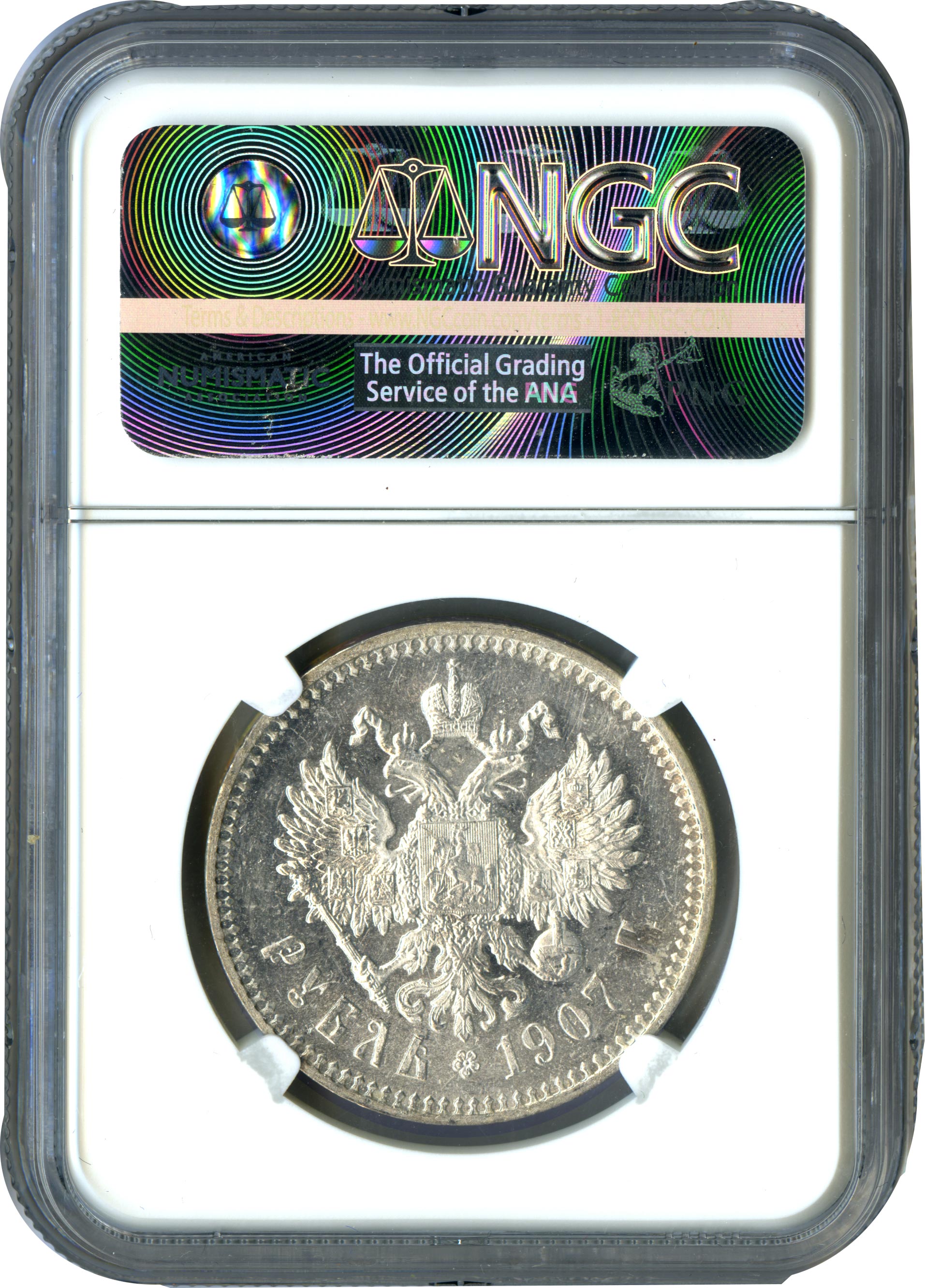Николай II сохраняет принятый отцом тип, но на банковских монетах его портрет (работы Васютинского) повернут влево (на запад). На оборотной стороне сохраняется тот же герб, вплоть до знака АГ под задней ногой коня.