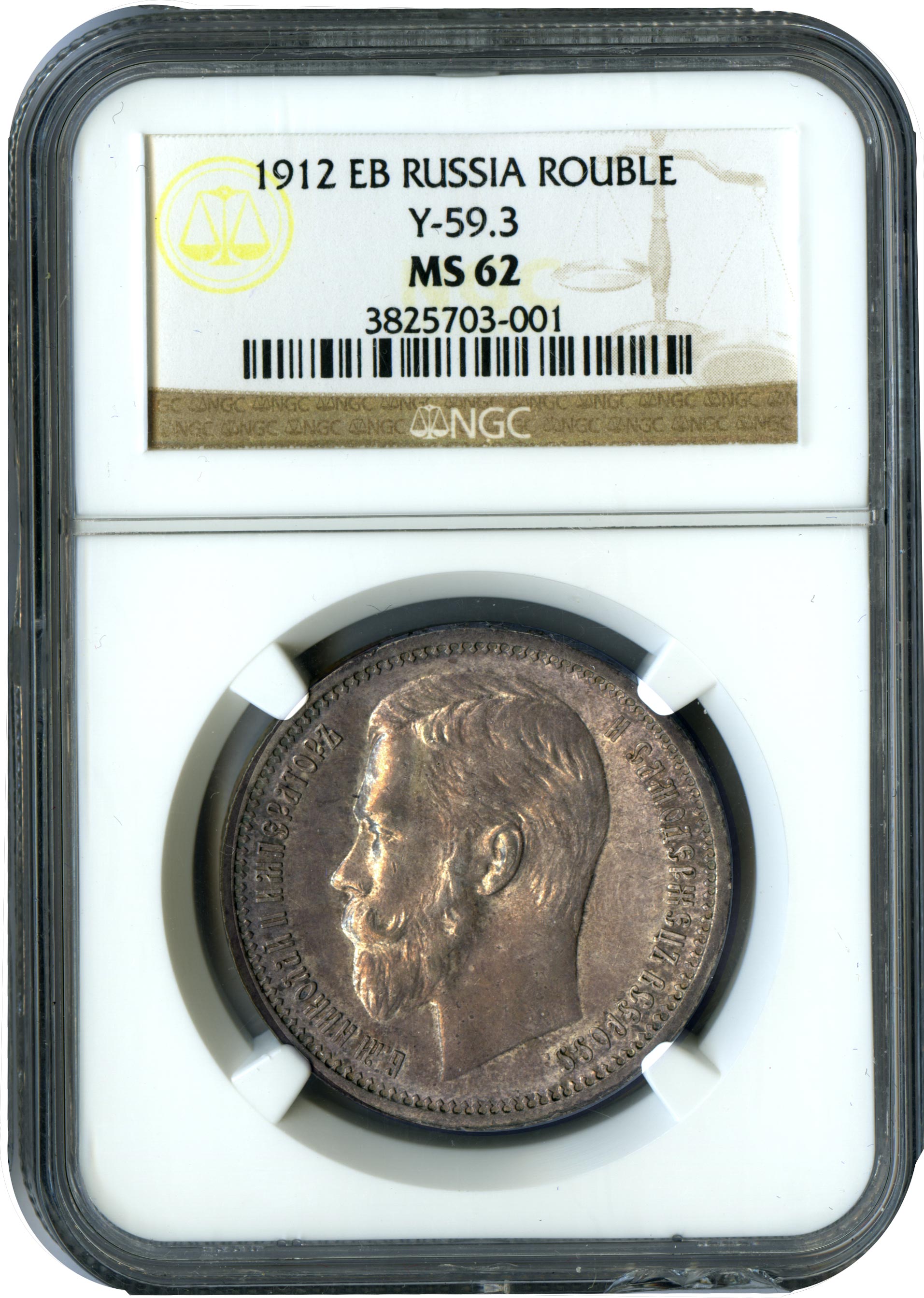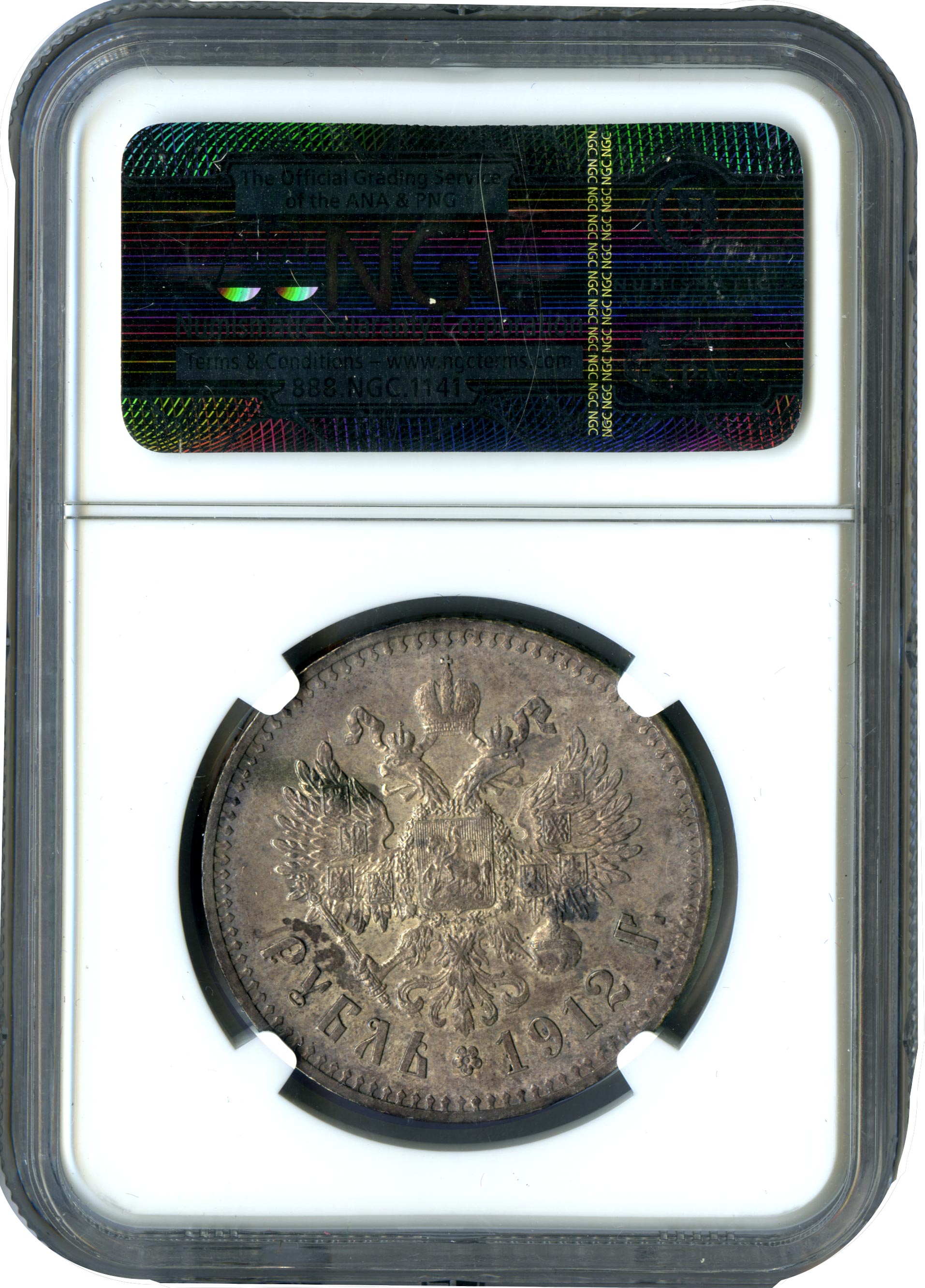 Николай II сохраняет принятый отцом тип, но на банковских монетах его портрет (работы Васютинского) повернут влево (на запад). На оборотной стороне сохраняется тот же герб, вплоть до знака АГ под задней ногой коня.