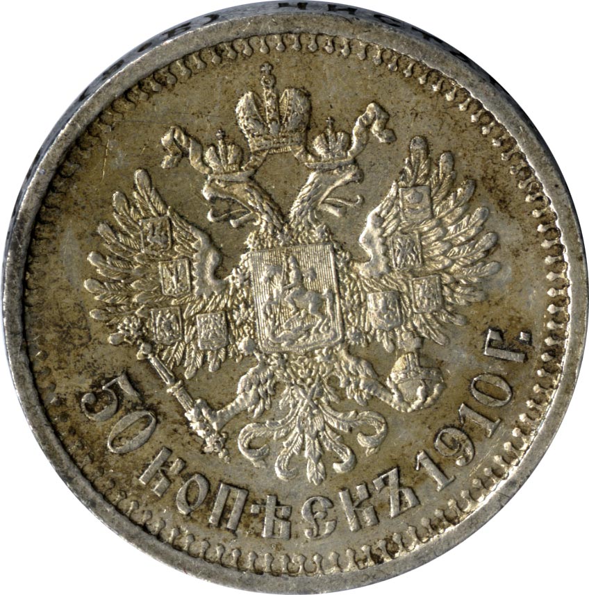 Лицевая сторона — портрет Николая II в круговой надписи «Б.М. НИКОЛАЙ II ИМПЕРАТОРЪ И САМОДЕРЖЕЦЪ ВСЕРОСС», оборотная — двуглавый орел, обозначение номинала (50 копеекъ) и дата.