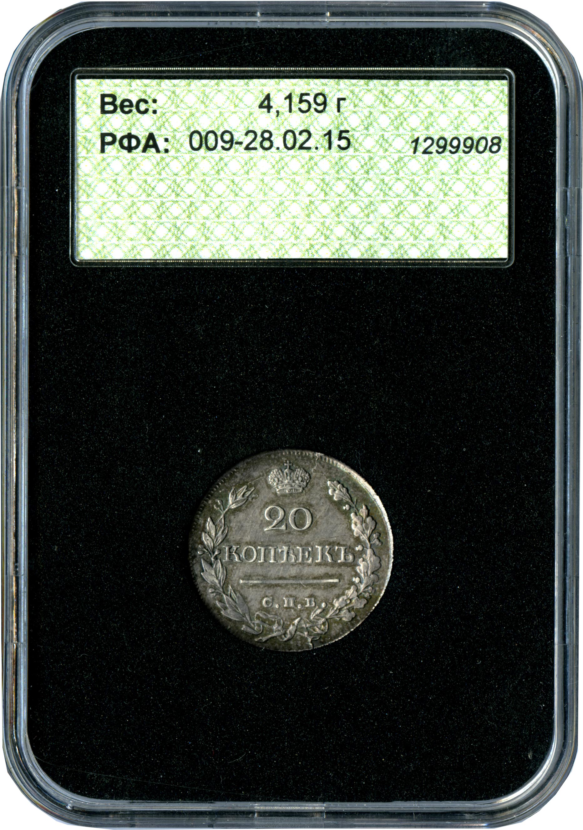 Лицевая сторона - двуглавый орел и дата, оборотная — обозначение номинала (20 копеекъ) в венке из лавровой и дубовой ветвей. Проба до 1813 года — 750, нормативный вес — 4,80 грамма; после 1813 года — проба 868, нормативный вес — 4,15 грамма.