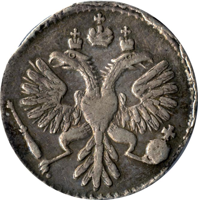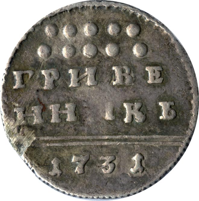 Чеканившиеся с 1731 года гривенники начали поступать в обращение только после указа от 14 августа 1734 года. До этого к середине 1733 года на монетном дворе «праздно лежали» 380 000 штук, в расходе двора на 28 марта 1735 года — 700 000 штук.
