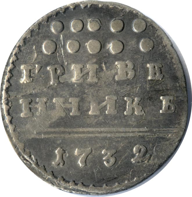 Чеканившиеся с 1731 года гривенники начали поступать в обращение только после указа от 14 августа 1734 года. До этого к середине 1733 года на монетном дворе «праздно лежали» 380 000 штук, в расходе двора на 28 марта 1735 года — 700 000 штук.