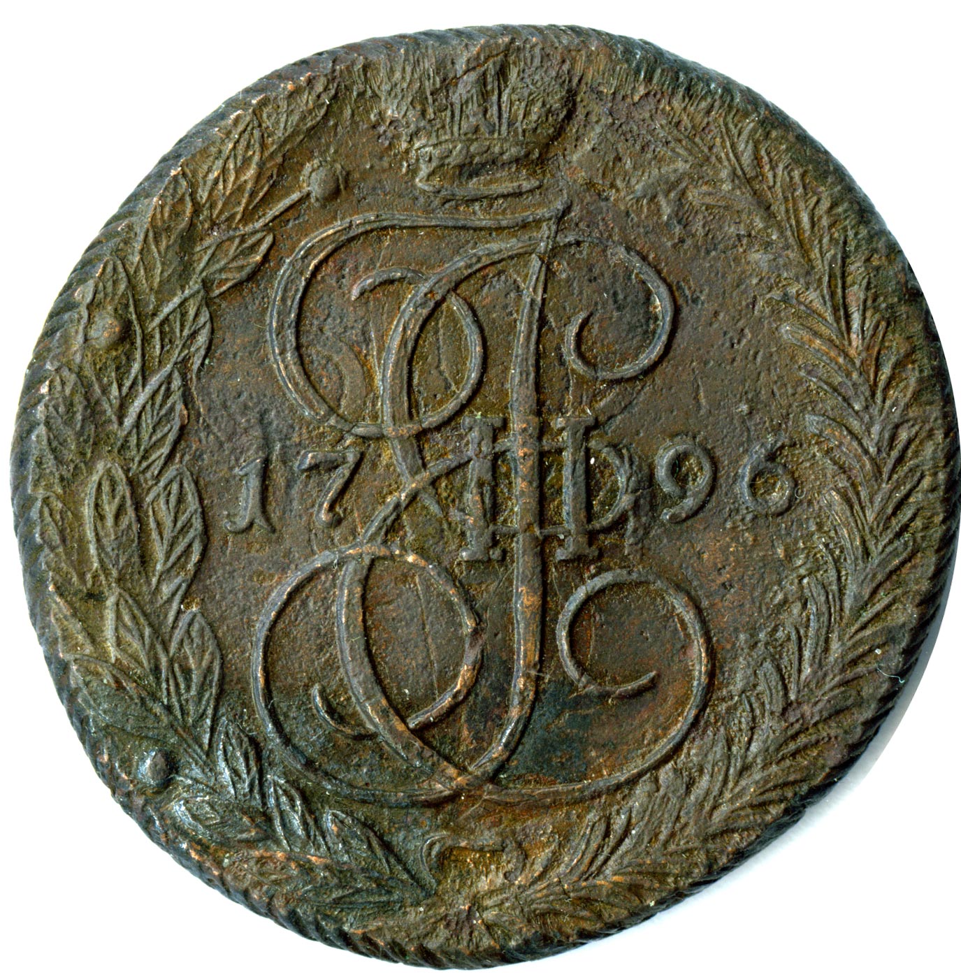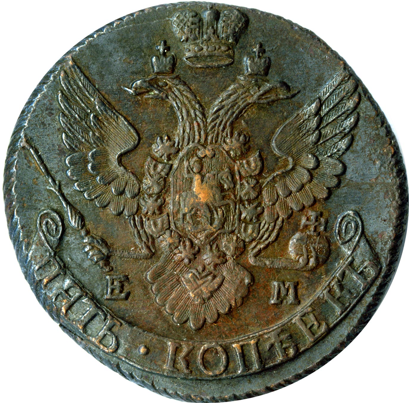 Лицевая сторона — двуглавый орел (выделяют 17 типов орла) и обозначение номинала (пять копеекъ), оборотная — вензель Екатерины II и дата. Нормативный вес — 51,19 грамма, гурт — сетка или шнур.
