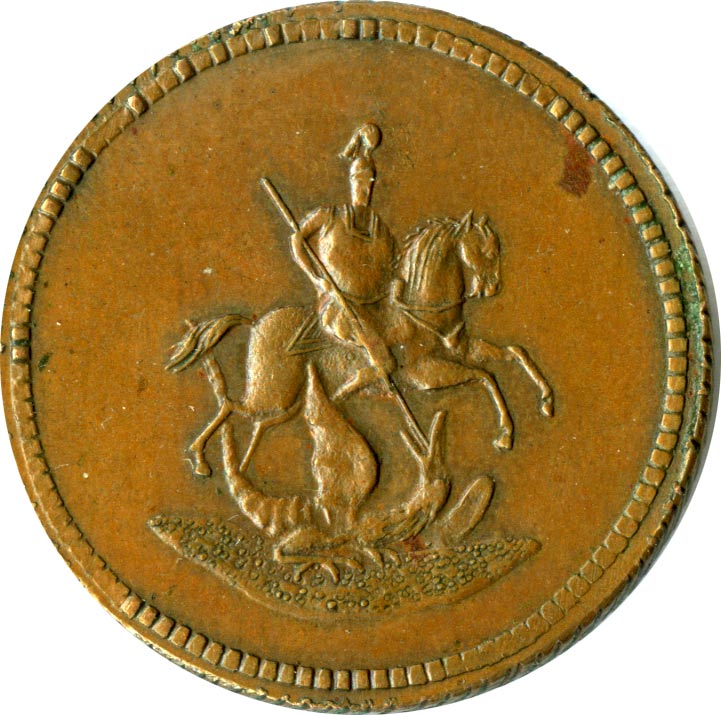 На лицевой стороне денги — Св. Георгий Победоносец, номинал обозначен прописью на оборотной.