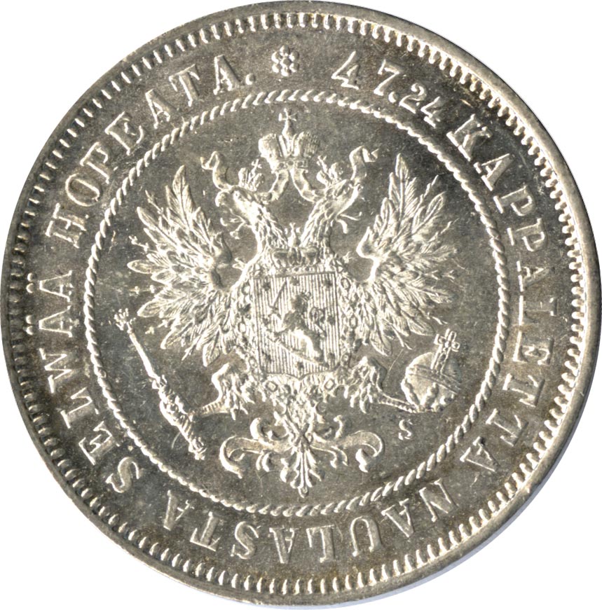 Лицевая сторона — российский двуглавый орел с гербом Великого княжества Финляндского на груди в кольцевой надписи с указанием количества штук (47,24) из фунта сплава серебра , оборотная — номинал и дата в венке из дубовых листьев. Проба — 868, нормативный вес — 10,37 грамма.