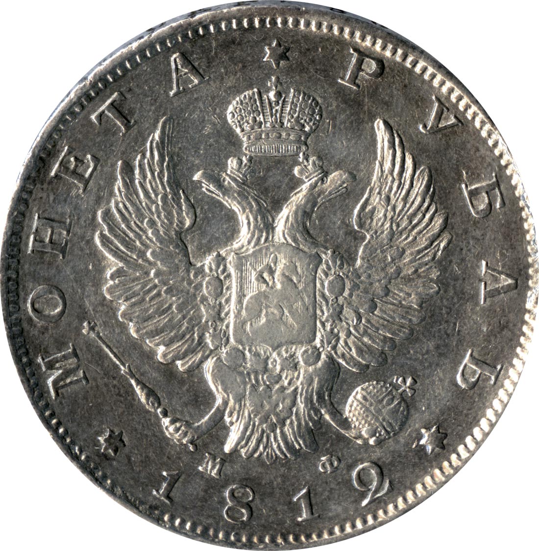 Манифест от 20 июня 1810 года «О новом устройстве монетной системы» устанавливает серебряный рубль законной мерой всех расчетов. Банковые монеты — рубли и полтины — изменяют свой внешний вид. Броская надпись внутри венка на оборотной стороне указывает содержание чистого серебра в монете, а номинал занимает скромное место вокруг орла. Гуртовая надпись сообщает о пробе и лигатурном весе.