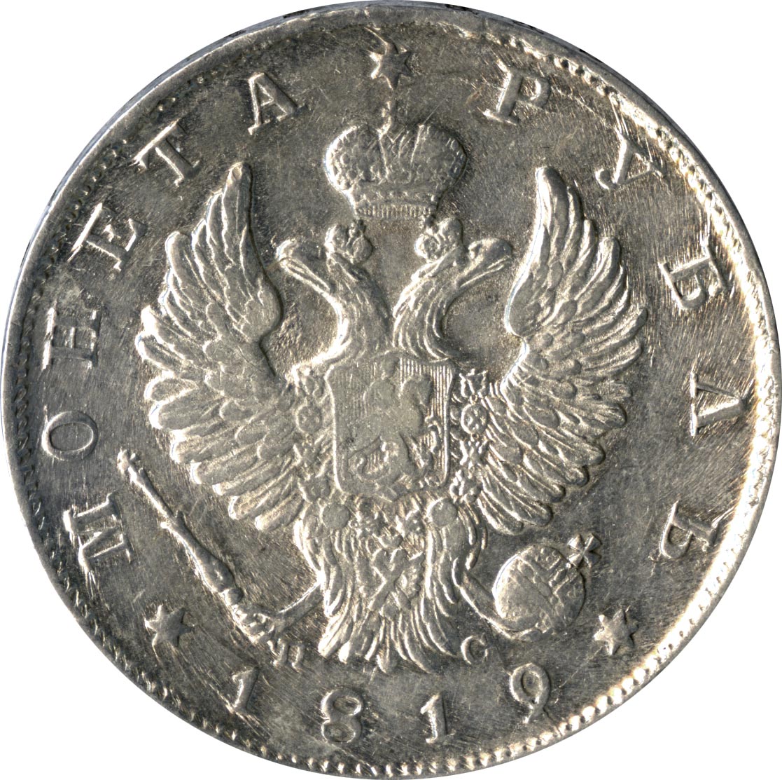 Манифест от 20 июня 1810 года «О новом устройстве монетной системы» устанавливает серебряный рубль законной мерой всех расчетов. Банковые монеты — рубли и полтины — изменяют свой внешний вид. Броская надпись внутри венка на оборотной стороне указывает содержание чистого серебра в монете, а номинал занимает скромное место вокруг орла. Гуртовая надпись сообщает о пробе и лигатурном весе.