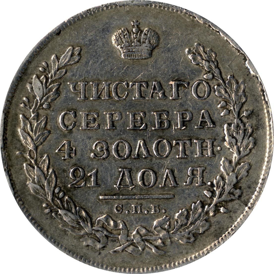 Лицевая сторона - «масонский орел», надпись «МОНЕТА РУБЛЬ» и дата, оборотная - окруженная венком из лавровой и дубовой ветвей надпись «ЧИСТАГО СЕРЕБРА 4 ЗОЛОТН 21 ДОЛЯ». Проба — 868, нормативный вес — 20,73 грамма.