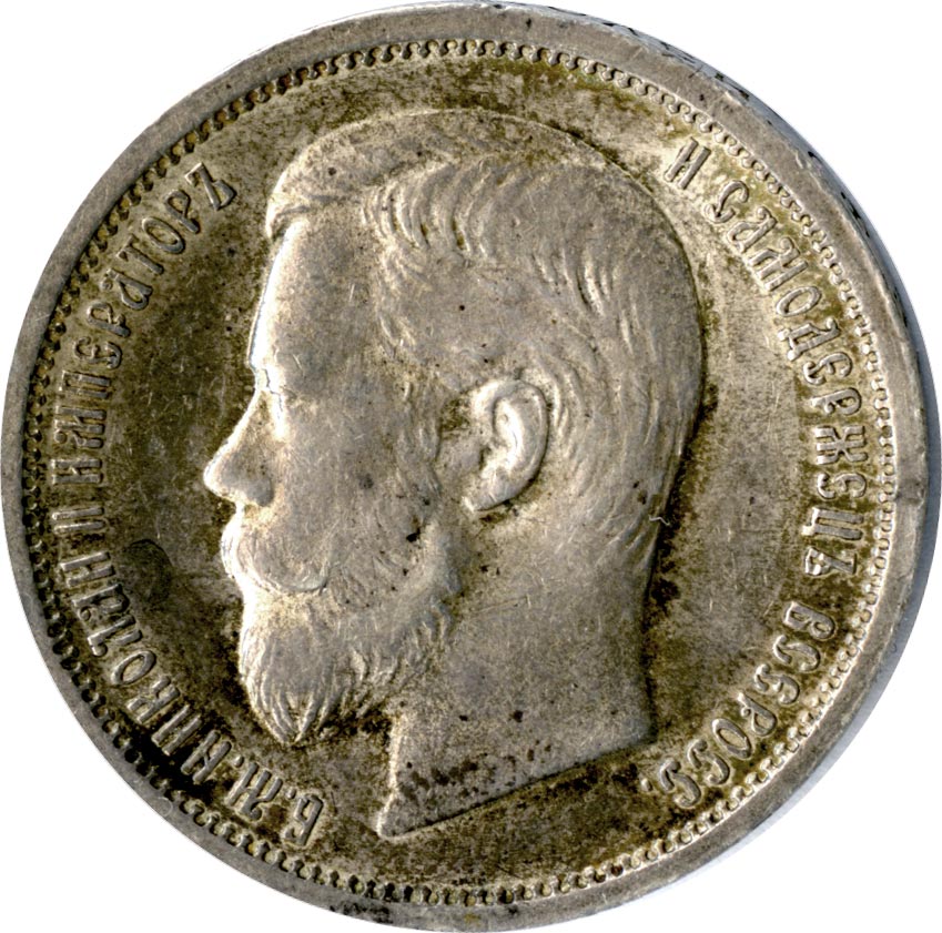 Николай II сохраняет принятый отцом тип, но на банковских монетах его портрет (работы Васютинского) повернут влево (на запад). На оборотной стороне сохраняется тот же герб, вплоть до знака АГ под задней ногой коня.