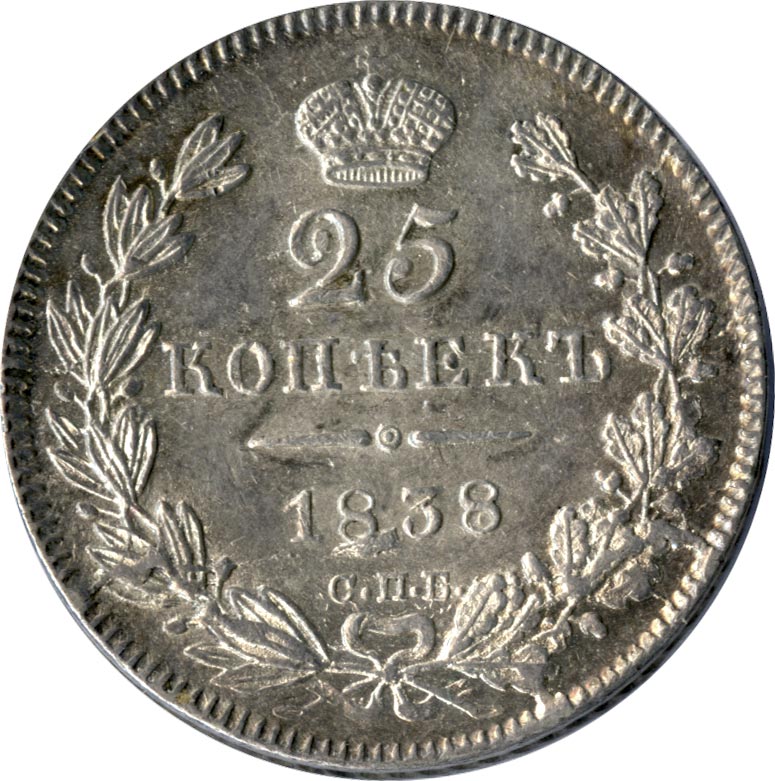 Лицевая сторона — новый гербовый орел с поднятыми крыльями и надпись «ЧИСТОГО СЕРЕБРА 1 ЗОЛОТНИКЪ 5 ДОЛЕЙ», оборотная —обозначение номинала (25 копеекъ), окруженное венком из лавровой и дубовой ветвей и дата.