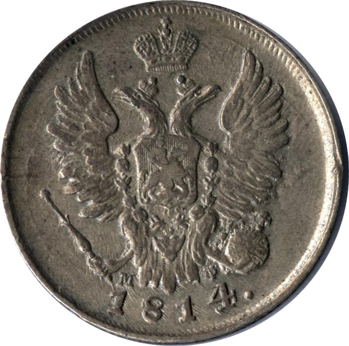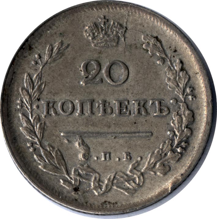 Лицевая сторона - двуглавый орел и дата, оборотная — обозначение номинала (20 копеекъ) в венке из лавровой и дубовой ветвей. Проба до 1813 года — 750, нормативный вес — 4,80 грамма; после 1813 года — проба 868, нормативный вес — 4,15 грамма.