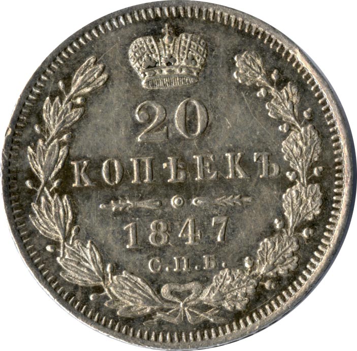 Лицевая сторона — новый гербовый орел с поднятыми крыльями, оборотная —обозначение номинала (20 копеекъ), окруженное венком из лавровой и дубовой ветвей и дата. Проба — 868, нормативный вес — 4,15 грамма.
