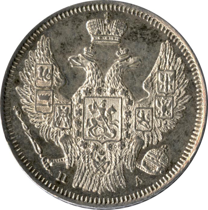 В январе 1830 года Николай I дает министру финансов Е. Ф. Канкрину устное указание «о сделании на золотых и серебряных монетах орла как на платиновых». На новом гербе крылья орла подняты, на них размещены шесть местных гербов — казанский, астраханский, сибирский, польский, херсонесский и финляндский. На груди орла — московский герб, на головах — короны. Выделяют шесть типов орла.