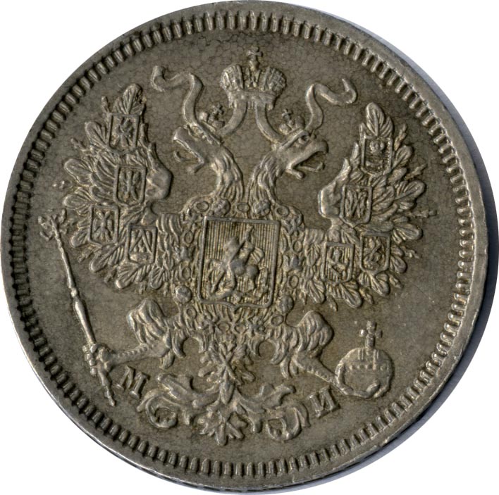 Лицевая сторона — гербовый орел, оборотная —обозначение номинала (20 копеекъ), окруженное венком из лавровой и дубовой ветвей и дата.