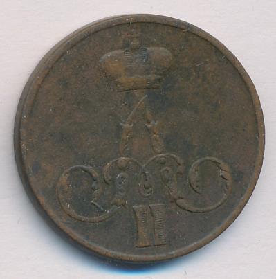 Лицевая сторона — вензель Николая I, оборотная — обозначение номинала (копейка) и дата. Нормативный вес — 5,12 грамма, гурт гладкий.