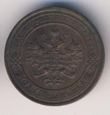 Лицевая сторона — двуглавый орел, надпись МЕДНАЯ РОССIЙСКАЯ МОНЕТА и обозначение номинала (одна копейка); оборотная — обозначение номинала (1 копейка) в бусовом ободке и дата. Нормативный вес — 3,28 грамма, гурт рубчатый.