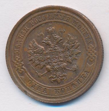 Лицевая сторона — двуглавый орел, надпись МЕДНАЯ РОССIЙСКАЯ МОНЕТА и обозначение номинала (одна копейка); оборотная — обозначение номинала (1 копейка) в бусовом ободке и дата. Нормативный вес — 3,28 грамма, гурт рубчатый.