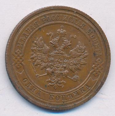 Лицевая сторона — двуглавый орел, надпись МЕДНАЯ РОССIЙСКАЯ МОНЕТА и обозначение номинала (одна копейка); оборотная — обозначение номинала (1 копейка) в бусовом ободке и дата. Нормативный вес — 3,28 грамма, гурт рубчатый.