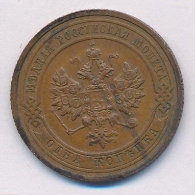 Лицевая сторона — двуглавый орел, надпись МЕДНАЯ РОССIЙСКАЯ МОНЕТА и обозначение номинала (одна копейка); оборотная — обозначение номинала (1 копейка) в бусовом ободке и дата. Нормативный вес — 3,28 грамма, гурт рубчатый.