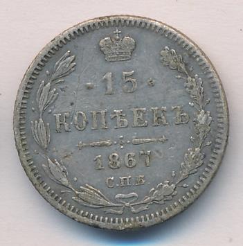 Лицевая сторона — гербовый орел, оборотная —обозначение номинала (15 копеекъ), окруженное венком из лавровой и дубовой ветвей и дата.