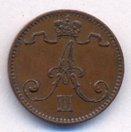Лицевая сторона — вензель Александра II, оборотная — номинал (1 PENNIA) и дата. Нормативный вес — 1,28 грамма, гурт гладкий.