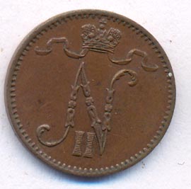 Лицевая сторона — вензель Александра II, оборотная — номинал (1 PENNIA) и дата. Нормативный вес — 1,28 грамма, гурт гладкий.