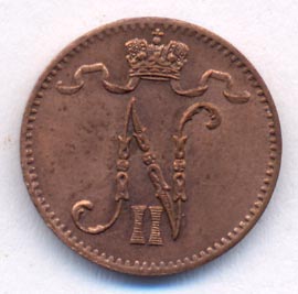 Лицевая сторона — вензель Александра II, оборотная — номинал (1 PENNIA) и дата. Нормативный вес — 1,28 грамма, гурт гладкий.