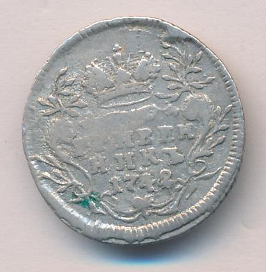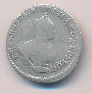 Лицевая сторона — портрет и надпись «Б М Елисаветъ I IMP I САМОД ВСЕРОС», оборотная — обозначение номинала (гривенникъ) и дата. Проба — 750 (с 1746 года - 802), нормативный вес — 2,59 грамма (с 1755 года — 2,42). Гурт — шнур.