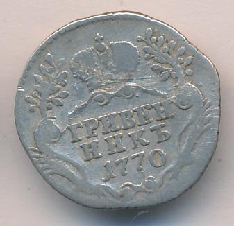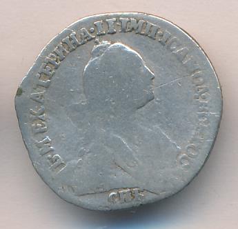 Лицевая сторона — портрет императрицы и надпись «Б М ЕКАТЕРИНА II IМП I САМОД ВСЕРОС», оборотная — обозначение номинала (гривенникъ) и дата. Проба — 750, нормативный вес — 2,37 грамма, гурт — шнур.