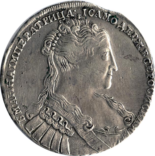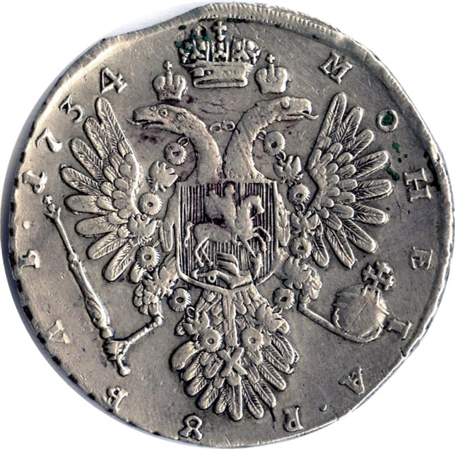 Рубль 1734 года «Корона (крест короны) разделяет надпись»
