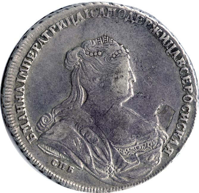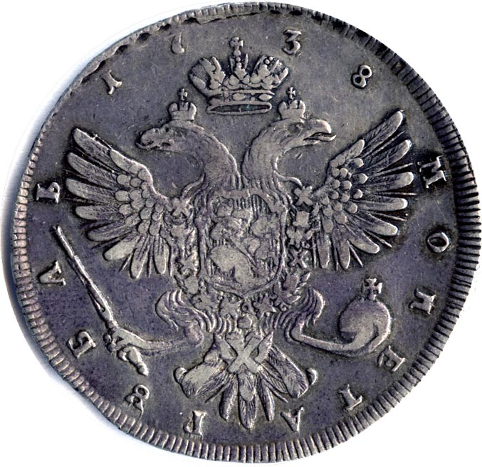 На первых рублях 1738 года не имеющих знака двора, лицевые штемпели сочетаются с двумя типами орла — московским и петербургским.