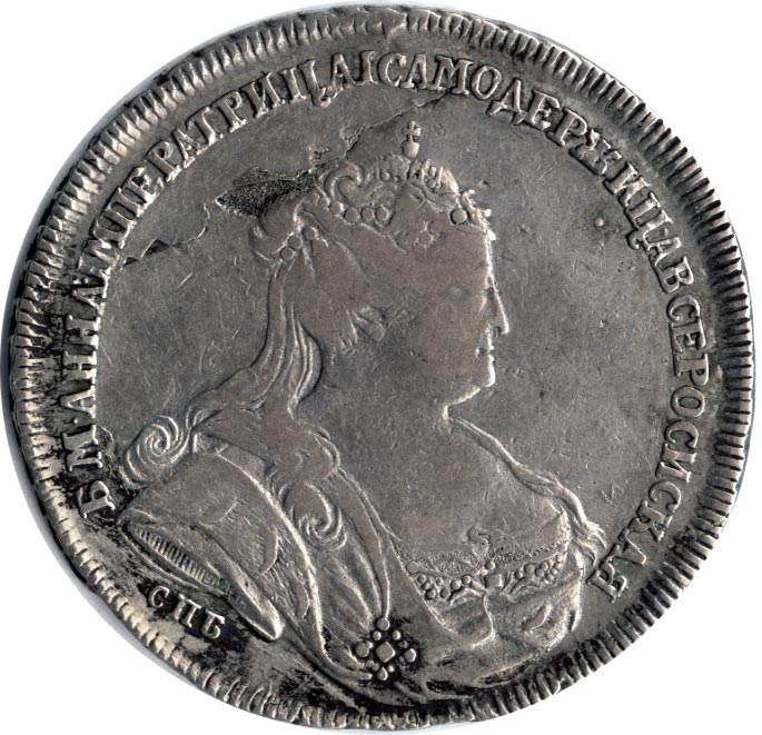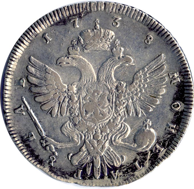 На первых рублях 1738 года не имеющих знака двора, лицевые штемпели сочетаются с двумя типами орла — московским и петербургским.