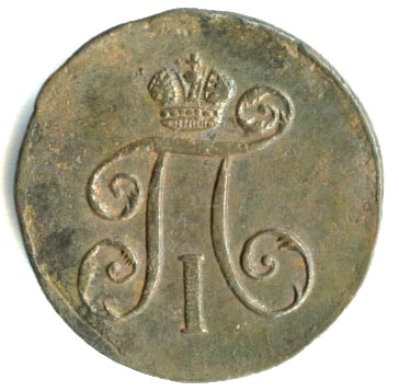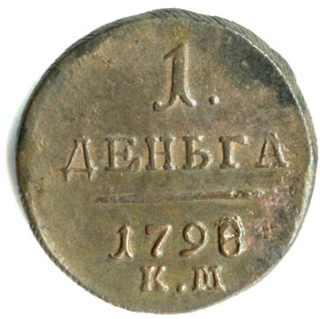 Лицевая сторона — вензель Павла I под короной, оборотная — номинал (1 деньга) и дата. Нормативный вес — 5,12 грамма, гурт — шнур.