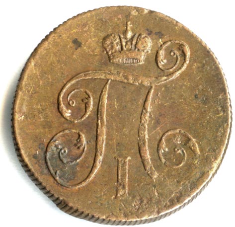 Лицевая сторона — вензель Павла I под короной, оборотная — номинал (1 копейка) и дата. Нормативный вес — 10,24 грамма, гурт — шнур.