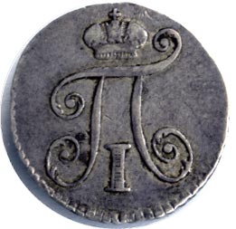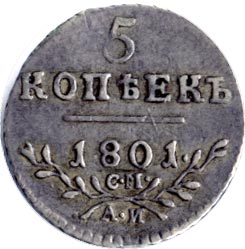 Лицевая сторона - вензель Павла I под короной, оборотная - обозначение номинала (5 копеекъ) и дата. Проба — 868, нормативный вес — 1,46 грамма, гурт — шнур.