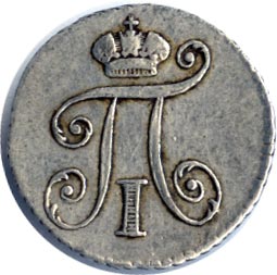 Лицевая сторона - вензель Павла I под короной, оборотная - обозначение номинала (5 копеекъ) и дата. Проба — 868, нормативный вес — 1,46 грамма, гурт — шнур.