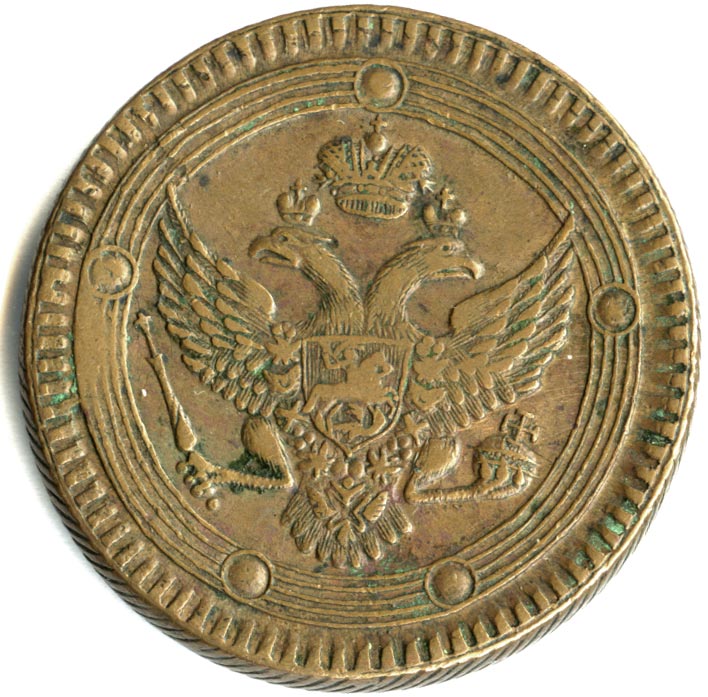 В первое десятилетие правления Александра I медным монетам возвращается принятый при Екатерине II ряд номиналов. Все они оформлены единообразно: на лицевой стороне — двуглавый орел, на оборотной — номинал и дата. Обе стороны обрамлены концентрическими линейными кружками, номинал дополнительно продублирован крупными счетными точками.