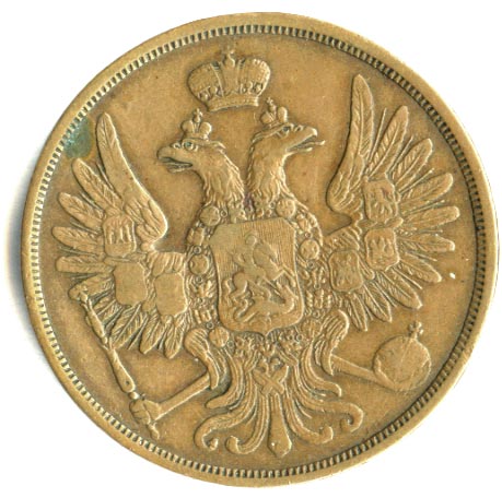 Меры правительства по стабилизации денежного обращения дали свои результаты, и указом от 7 февраля 1849 года следует очередное удвоение монетной стопы до 32 рублей из пуда. Новую монету решено делать улучшенного оформления и повышенного качества изготовления. На лицевую сторону возвращается государственный герб, а все производство ведется только на Екатеринбургском дворе (знак ЕМ), который после 1844 года усиленно перестраивается и переоснащается по образцу Петербургского. С 1850 года к нему подключается Варшавский (знак ВМ), получивший специальное разрешение на выпуск общегосударственной медной монеты. Штемпельный инструмент для обоих дворов готовит Петербургский двор. Новые монеты поступают в обращение только после указа от 23 января 1853 года, после приготовления на общую сумму 870 720 рублей (без учета Варшавской чеканки).