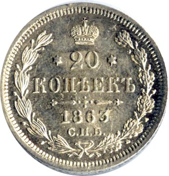 Указом от 22 марта 1860 года для двадцатикопеечников, пятнадцатикопеечников, десятикопеечников и пятикопеечников содержание серебра снижается на 15% и устанавливается 72/96 проба, а указом от 21 марта 1867 года следует снижение еще более чем в полтора раза — нормативный вес уменьшается на 10%, а проба падает до 48/96. Последняя норма сохраняется для разменной монеты вплоть до 1917 года.