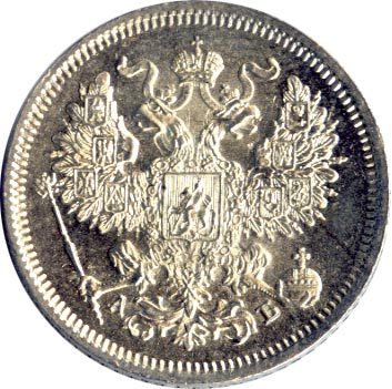 Лицевая сторона — гербовый орел, оборотная —обозначение номинала (20 копеекъ), окруженное венком из лавровой и дубовой ветвей и дата.