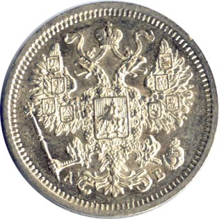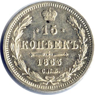 Лицевая сторона — гербовый орел, оборотная —обозначение номинала (15 копеекъ), окруженное венком из лавровой и дубовой ветвей и дата.