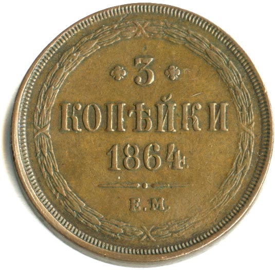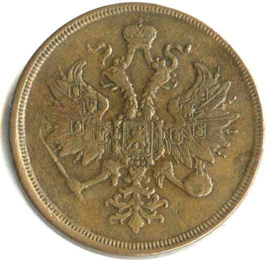 Лицевая сторона — двуглавый орел, оборотная — обозначение номинала (3 копейки) и дата. Нормативный вес — 15,36 грамма, гурт гладкий.