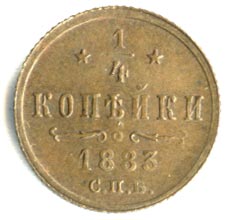 Лицевая сторона — вензель Александра II в венке из лавровой и дубовой ветвей; оборотная — обозначение номинала (1/4 копейки) и дата. Нормативный вес — 0,82 грамма, гурт рубчатый.