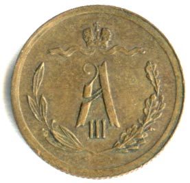 Указом от 21 марта 1867 года Александр II утверждает 50-рублевую стопу для медных монет. Новые монеты получают усложненное оформление, дополнительным отличием от прежних выпусков служит рубчатый гурт (чеканка ведется без предварительного гурчения кружков в неразъемном рубчатом кольце).