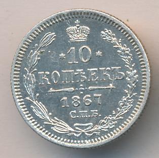Лицевая сторона — гербовый орел, оборотная —обозначение номинала (10 копеекъ), окруженное венком из лавровой и дубовой ветвей и дата.