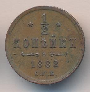 Лицевая сторона — вензель Александра II в венке из лавровой и дубовой ветвей; оборотная — обозначение номинала (1/2 копейки) и дата. Нормативный вес — 1,64 грамма, гурт рубчатый.