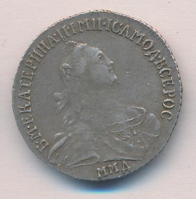 Выделяют два типа - «с шарфом на шее» и без него. На оборотной стороне монеты — пятнадцать счетных точек. Лицевая сторона — портрет императрицы и надпись «Б М ЕКАТЕРИНА II IМП I САМОД ВСЕРОС», оборотная — двуглавый орел, обозначение номинала цифрой и счетными точками и дата. Проба — 750, нормативный вес — 3,56 грамма, гурт — шнур.