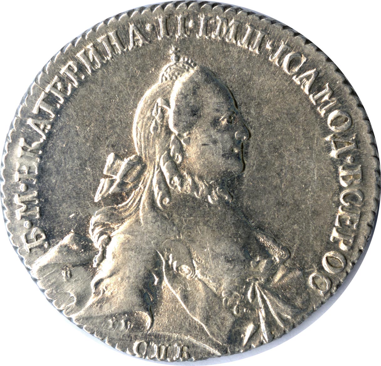 Лицевая сторона — портрет императрицы и надпись «Б М ЕКАТЕРИНА II IМП I САМОД ВСЕРОС», оборотная — двуглавый орел и надпись «МОНЕТА РУБЛЬ» и дата. Проба — 750, нормативный вес — 24 грамма, гурт — шнур.