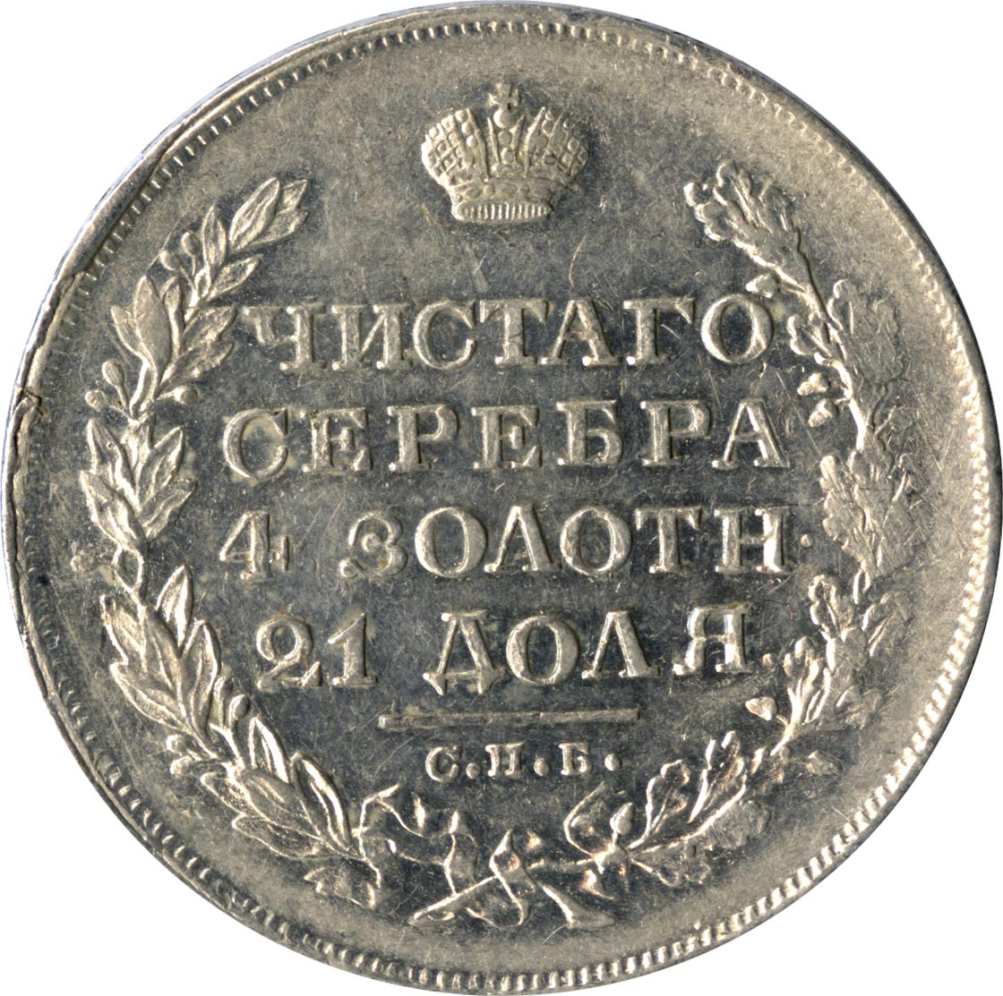 Лицевая сторона - «масонский орел», надпись «МОНЕТА РУБЛЬ» и дата, оборотная - окруженная венком из лавровой и дубовой ветвей надпись «ЧИСТАГО СЕРЕБРА 4 ЗОЛОТН 21 ДОЛЯ». Проба — 868, нормативный вес — 20,73 грамма.