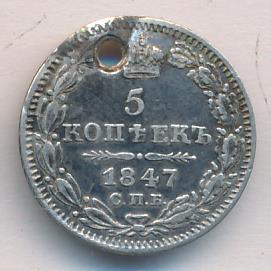 Лицевая сторона — новый гербовый орел с поднятыми крыльями, оборотная —обозначение номинала (5 копеекъ), окруженное венком из лавровой и дубовой ветвей и дата. Проба — 868, нормативный вес — 1,04 грамма.